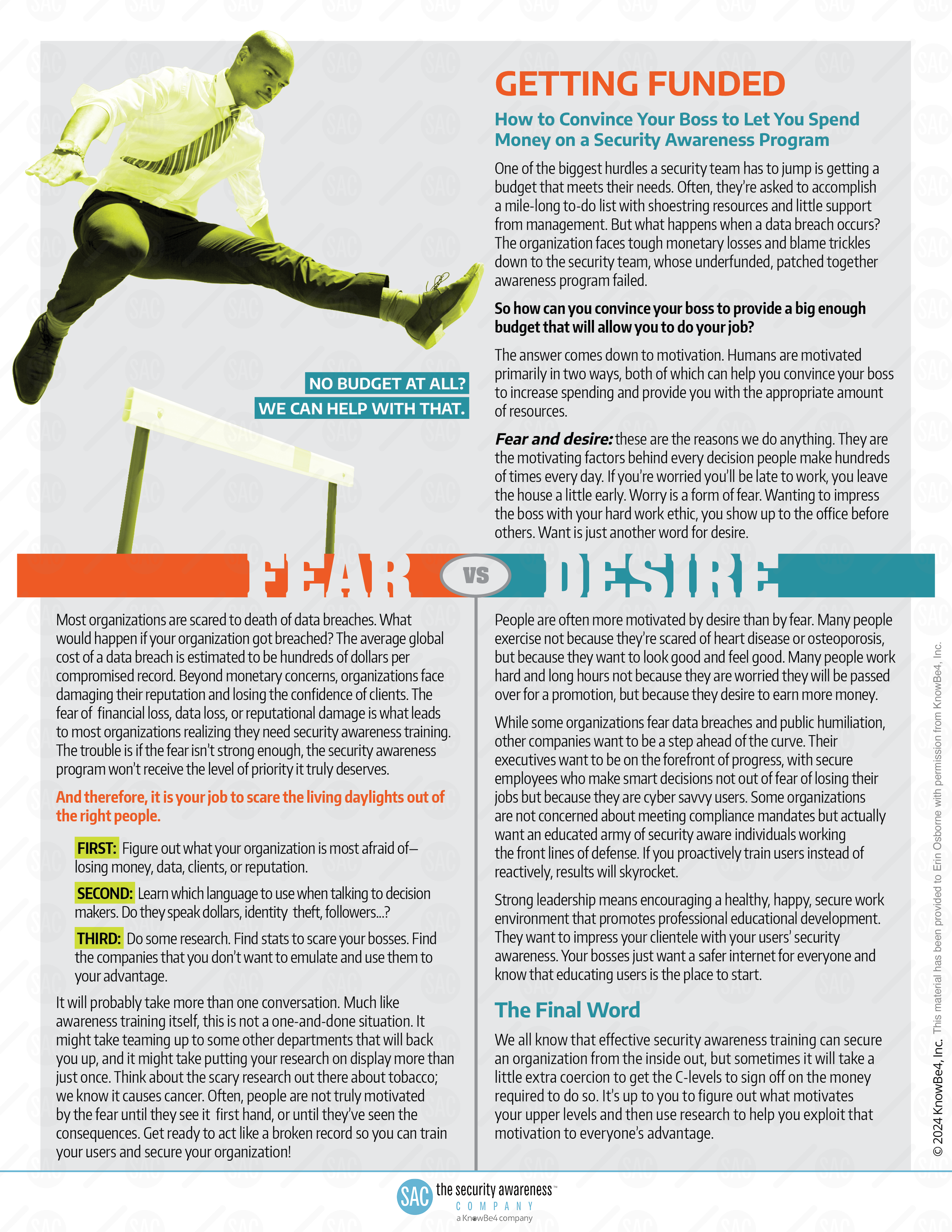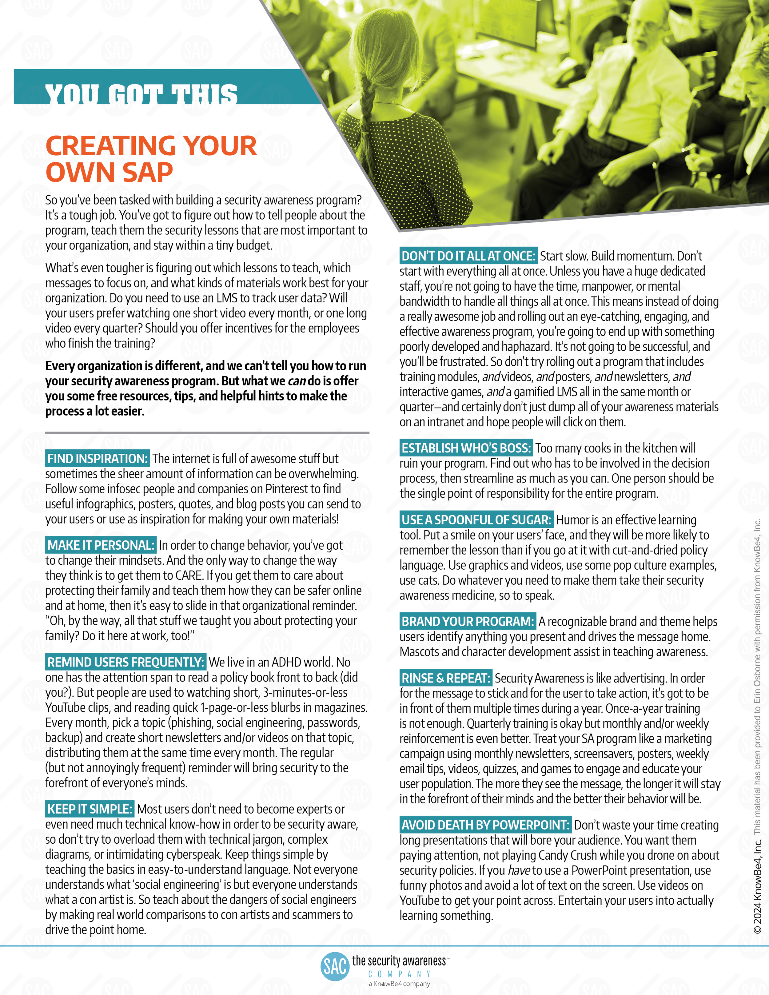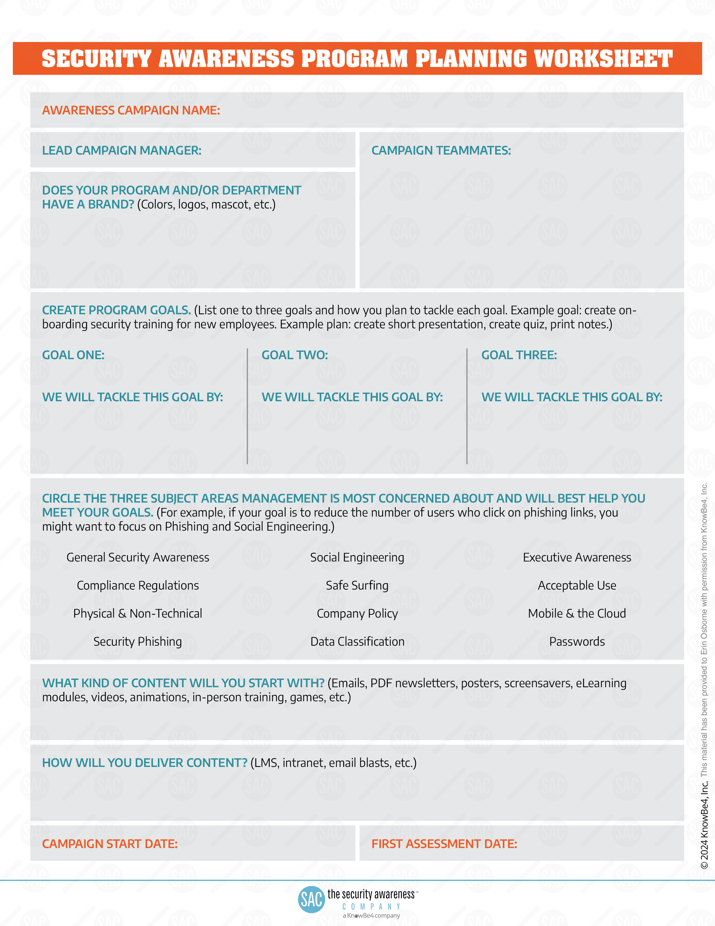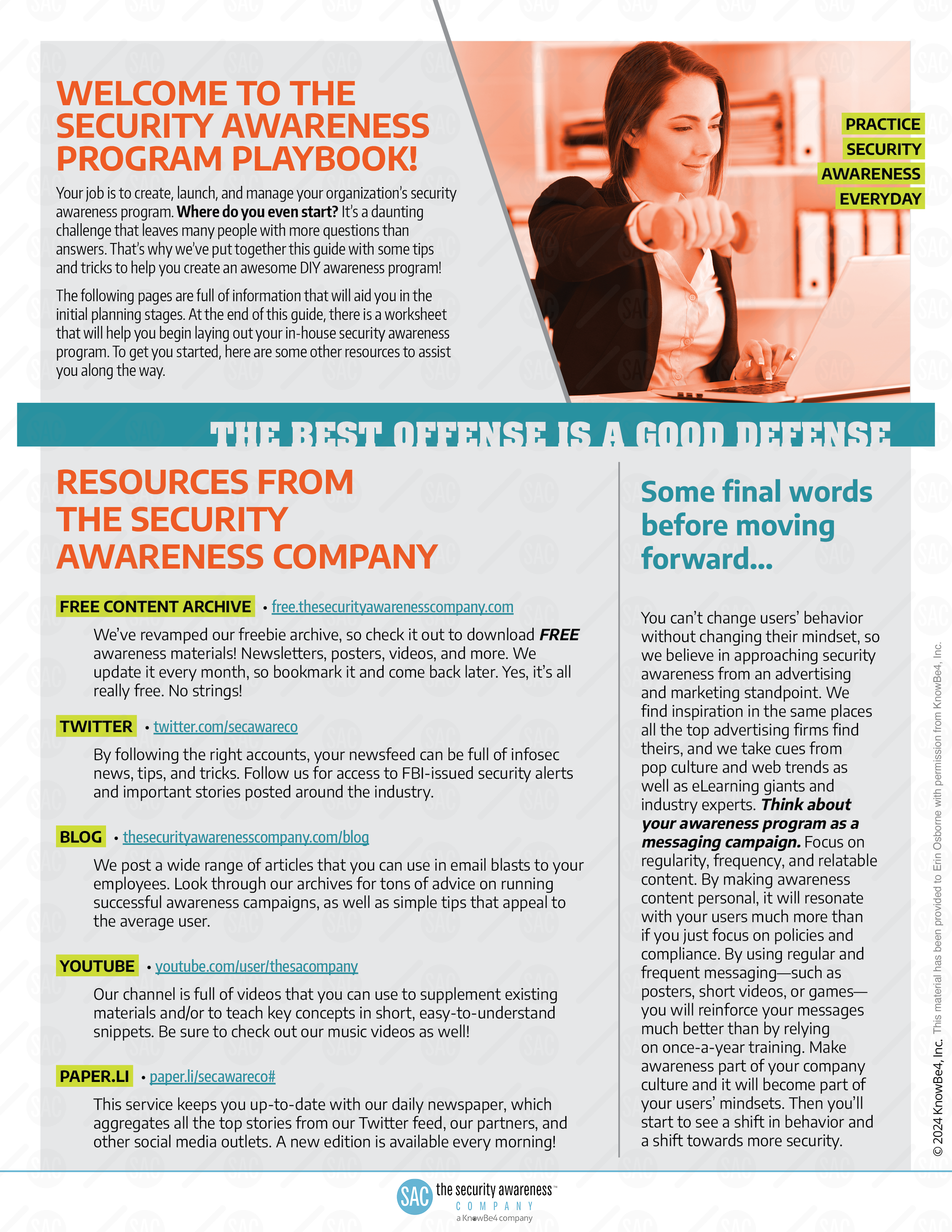 Originally developed for NCSAM 2018, the SAP Playbook was a complimentary resource offered by the Security Awareness Company to support the creation and growth of effective Security Awareness Programs. Designed with beginners in mind, it provided practical guidance on securing executive buy-in and funding for these initiatives. The final page featured an interactive worksheet to help users outline a basic program framework and start tracking their progress toward building a more secure organization.